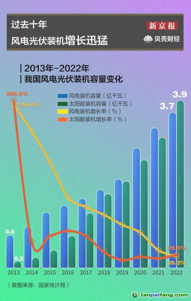 風(fēng)電光伏裝機(jī)增長迅猛,新能源電將成為主流。過去十年,我國風(fēng)電、太陽能裝機(jī)規(guī)模保持較快增長,年均增速超50%,超總裝機(jī)年均增長率40個(gè)百分點(diǎn)以上。截至2022年底,全國風(fēng)電光伏發(fā)電裝機(jī)突破了7億千瓦,風(fēng)電、光伏發(fā)電裝機(jī)均處于世界第一。其中,全國風(fēng)電裝機(jī)總?cè)萘窟_(dá)3.66億千瓦,太陽能裝機(jī)容量達(dá)3.94億千瓦,相比上年增速均在20%以上。此外,2022年太陽能新增裝機(jī)容量最多,占新增裝機(jī)總?cè)萘康?3.8%。 本文`內(nèi)-容-來-自;中_國_碳_交^易=網(wǎng) tan pa i fa ng . c om