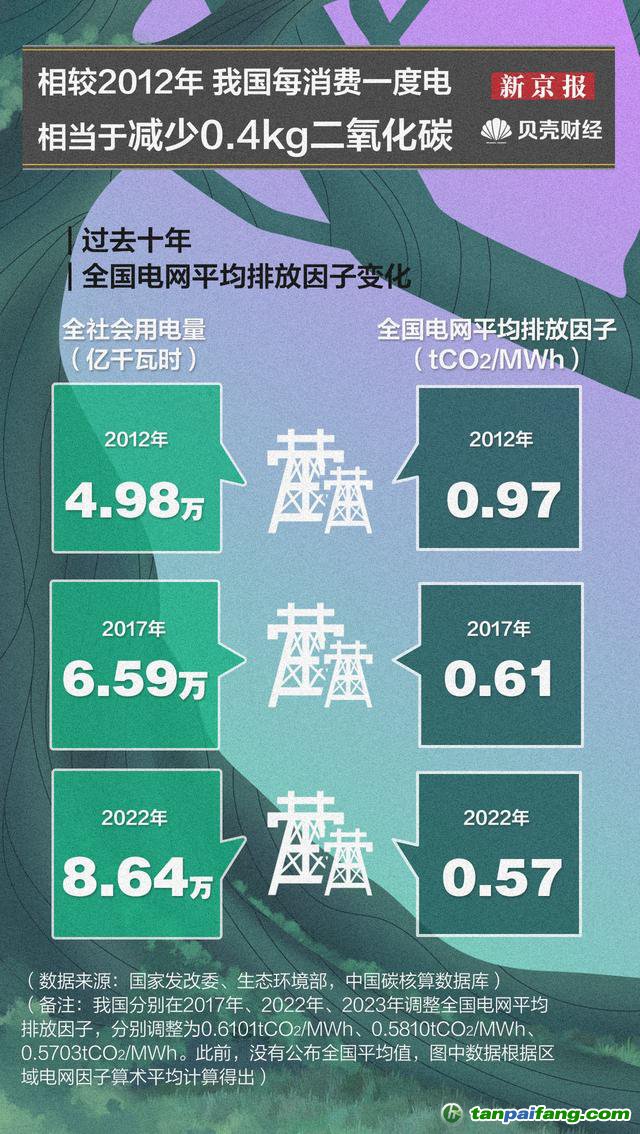 在新能源裝機(jī)和發(fā)電規(guī)模不斷增長的背景下,我國電網(wǎng)綠色低碳化發(fā)展趨勢越發(fā)明顯。區(qū)域電網(wǎng)平均排放因子又叫電網(wǎng)用電排放因子,它表示的是某區(qū)域范圍內(nèi)使用1度電產(chǎn)生的碳排放量。經(jīng)貝殼財(cái)經(jīng)零碳研究院研究員測算,過去十年,全國電網(wǎng)平均排放因子從2012年的0.97tCO2/MWh下降到2022年的0.57tCO2/MWh,即每消費(fèi)一度電相當(dāng)于減少0.4kg二氧化碳。