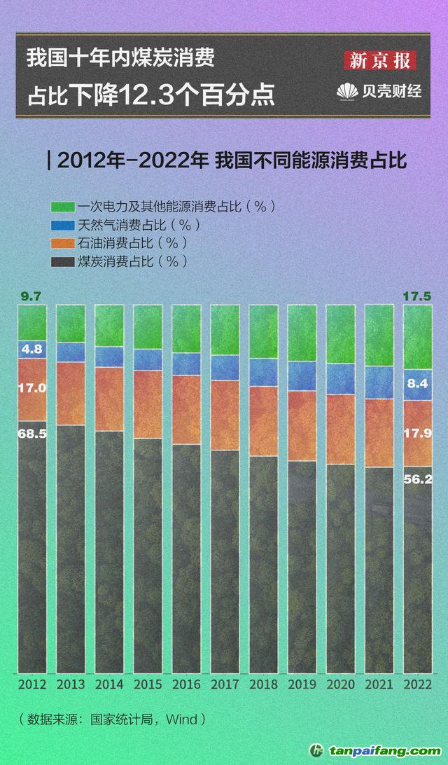 但我國能源消費(fèi)格局發(fā)生大變化,煤炭、石油、天然氣這樣的化石能源消耗一路下降,從2012年的90.3%下降至2022年的82.5%。其中煤炭資源下降最快,到2022年,全國煤炭消費(fèi)占比達(dá)56.2%,相比于2012年下降12.3個(gè)百分點(diǎn)。與此同時(shí),一次電力等能源消費(fèi)占比逐步提升,從2012年的9.7%上升到2022年的17.5%。 本*文`內(nèi)/容/來/自:中-國-碳^排-放“交|易^網(wǎng)-tan pai fang . c o m