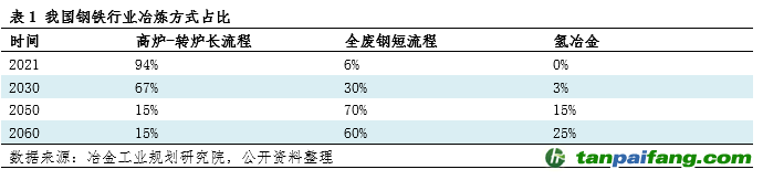 而冶煉方式的轉(zhuǎn)變具體分為兩種方式:一種是由目前的高爐-轉(zhuǎn)爐的長流程煉鋼轉(zhuǎn)向全廢鋼電爐的短流程煉鋼,另一種是利用氫冶金技術(shù)代替碳冶金技術(shù)。根據(jù)表1中冶金工業(yè)規(guī)劃研究院的數(shù)據(jù)顯示目前我國的鋼鐵生產(chǎn)中有94%是通過長流程完成的,僅有6%通過短流程完成。當(dāng)?shù)?030的時候,我國鋼鐵鋼業(yè)已經(jīng)實(shí)現(xiàn)“碳達(dá)峰”目標(biāo),此時我國的鋼鐵生產(chǎn)有67%是通過長流程完成,30%通過短流程完成,3%通過氫冶金完成。當(dāng)?shù)?050年的時候,我國距離實(shí)現(xiàn)“碳中和”目標(biāo)還差最后十年,此時我國的鋼鐵生產(chǎn)有15%通過長流程完成,70%通過短流程完成,15%通過氫冶金完成。當(dāng)?shù)?060年的時候,我國已經(jīng)實(shí)現(xiàn)“碳中和”目標(biāo),此時我國的鋼鐵生產(chǎn)有15%通過長流程完成,但是由于我國鋼鐵總產(chǎn)量的下降使得廢鋼資源有所減少,因此60%通過短流程完成,剩下25%的產(chǎn)量則通過氫冶金完成。 本/文-內(nèi)/容/來/自:中-國-碳-排-放-網(wǎng)-tan pai fang . com