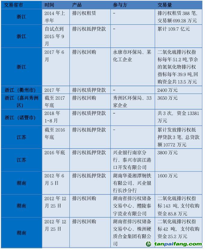 我國(guó)較早就開始探索基于排污權(quán)的融資工具,浙江省在2010年就出臺(tái)了排污權(quán)抵押暫行規(guī)定,開始排污權(quán)抵押貸款相關(guān)工作。目前12個(gè)政府批復(fù)的試點(diǎn)省市多數(shù)都允許進(jìn)行抵押和質(zhì)押貸款、租賃、回購(gòu)等融資方式。