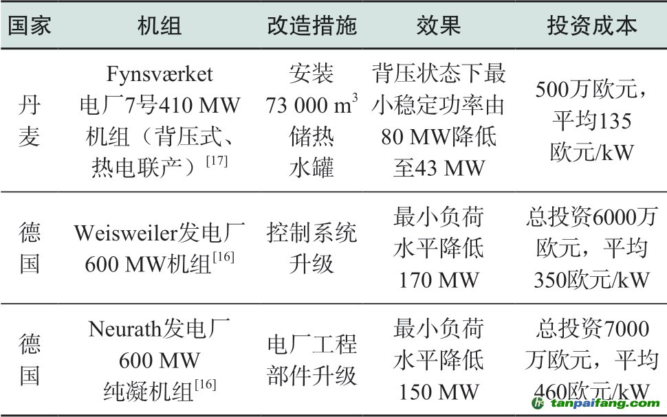 機(jī)組靈活改造的設(shè)備投資成本是影響發(fā)電廠參與深度調(diào)峰積極性的重要因素。實(shí)現(xiàn)靈活性改造的技術(shù)路徑包括改變?nèi)紵绞健文ッ簷C(jī)運(yùn)行、升級控制系統(tǒng)、加裝輔助燃燒裝置等[16],不同改造措施的效果-成本曲線有所差異,但改造成本與最低穩(wěn)定功率減少量基本滿足線性關(guān)系,靈活性改造所需一次投資費(fèi)用約為100~500歐元/kW[16]。表1梳理了典型火電機(jī)組改造項(xiàng)目的效果及投資情況。 本文@內(nèi)/容/來/自:中-國-碳^排-放-交易&*網(wǎng)-tan pai fang . com