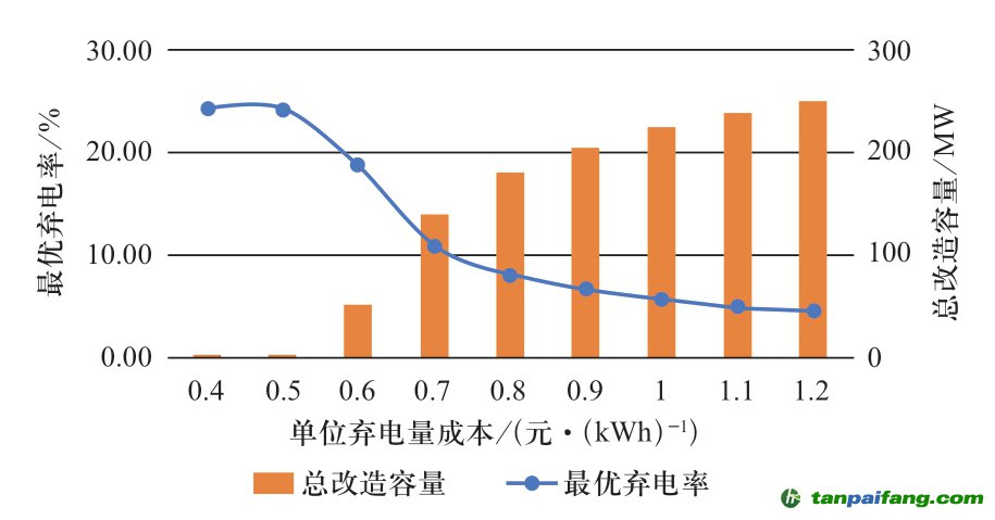 進(jìn)一步探討不同棄電成本下的優(yōu)化結(jié)果。計算獲得不同單位棄電量成本下,廣義成本最小時的火電機(jī)組改造總?cè)萘亢拖到y(tǒng)棄電率(下稱“最優(yōu)棄電率”),結(jié)果如圖6所示。由圖可知,當(dāng)單位棄電成本大于 0.5元/kWh時,靈活性改造容量為正,說明靈活性改造能夠減少廣義成本。當(dāng)單位棄電量成本超過1元/kWh時,改造容量增加緩慢,最優(yōu)棄電率基本維持在5%水平上。若單位棄電成本直接取風(fēng)電上網(wǎng)電價,考慮到國內(nèi)大部分地區(qū)的新能源電價水平,則系統(tǒng)棄電率控制在8%水平的可行性最高。 內(nèi)-容-來-自;中_國_碳_0排放¥交-易=網(wǎng) t an pa i fa ng . c om