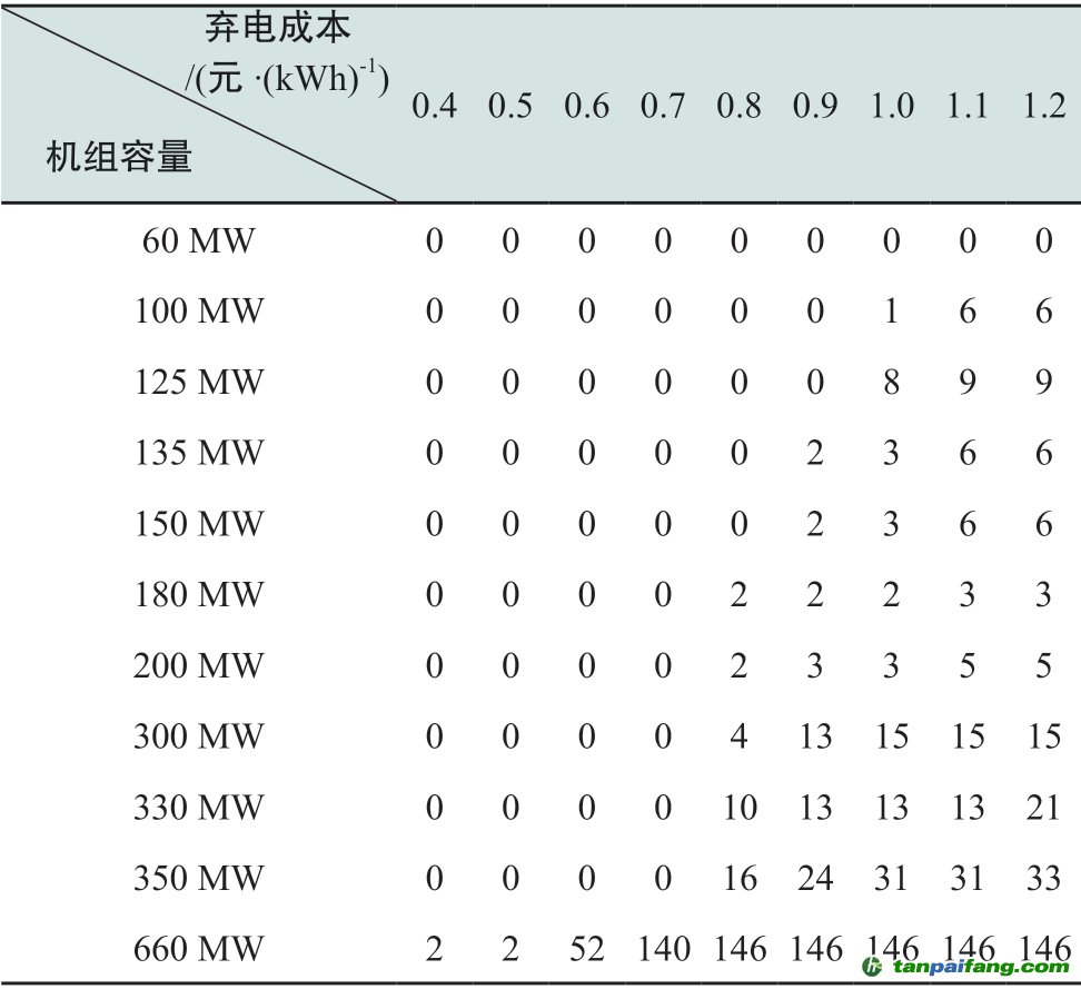 11臺機(jī)組的具體改造容量規(guī)劃結(jié)果如表2所示。由表2可知,改造容量分配方案基本滿足“大容量機(jī)組優(yōu)先”原則,660 MW、350 MW、330 MW機(jī)組為主要改造機(jī)組。隨著單位棄電量成本增加,各機(jī)組改造容量單調(diào)增加,但在棄電成本取1.0元/kWh時,125 MW機(jī)組的改造容量突然超過稍大容量的機(jī)組,結(jié)果局部存在波動,說明小容量機(jī)組的改造效果相近。在單位棄電成本由0.6元/kWh增加至0.7元/kWh時,660 MW機(jī)組的改造容量突然從52 MW增加至 140 MW,這是由于在該價格范圍內(nèi),靈活改造容量的總需求變化較為劇烈,同時,660 MW機(jī)組接受第二檔深度調(diào)峰補(bǔ)償?shù)呐R界改造容量為68 MW,在棄電成本變?yōu)?.7元/kWh后,改造其他機(jī)組帶來的成本增量將大于660 MW第二檔深調(diào)補(bǔ)償成本,所以繼續(xù)優(yōu)先改造660 MW機(jī)組。