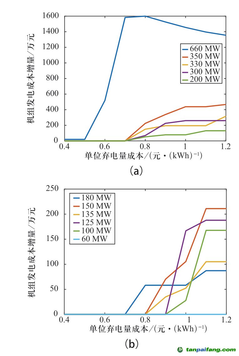 另外,在算例所設(shè)場景下,改造成本、發(fā)電成本增量占比較小,與單位棄電成本成近似線性關(guān)系。除棄電成本外,火電機(jī)組的調(diào)峰補(bǔ)償成本在其他4項(xiàng)成本中最多,并且在單位棄電電價超過0.9元/kWh后,高于棄電成本,維持在4億元左右。由于兩檔補(bǔ)償價格的不同,調(diào)峰補(bǔ)償成本變化趨勢與售電收益損失有所不同。 本@文$內(nèi).容.來.自:中`國`碳`排*放^交*易^網(wǎng) t a np ai fan g.c om