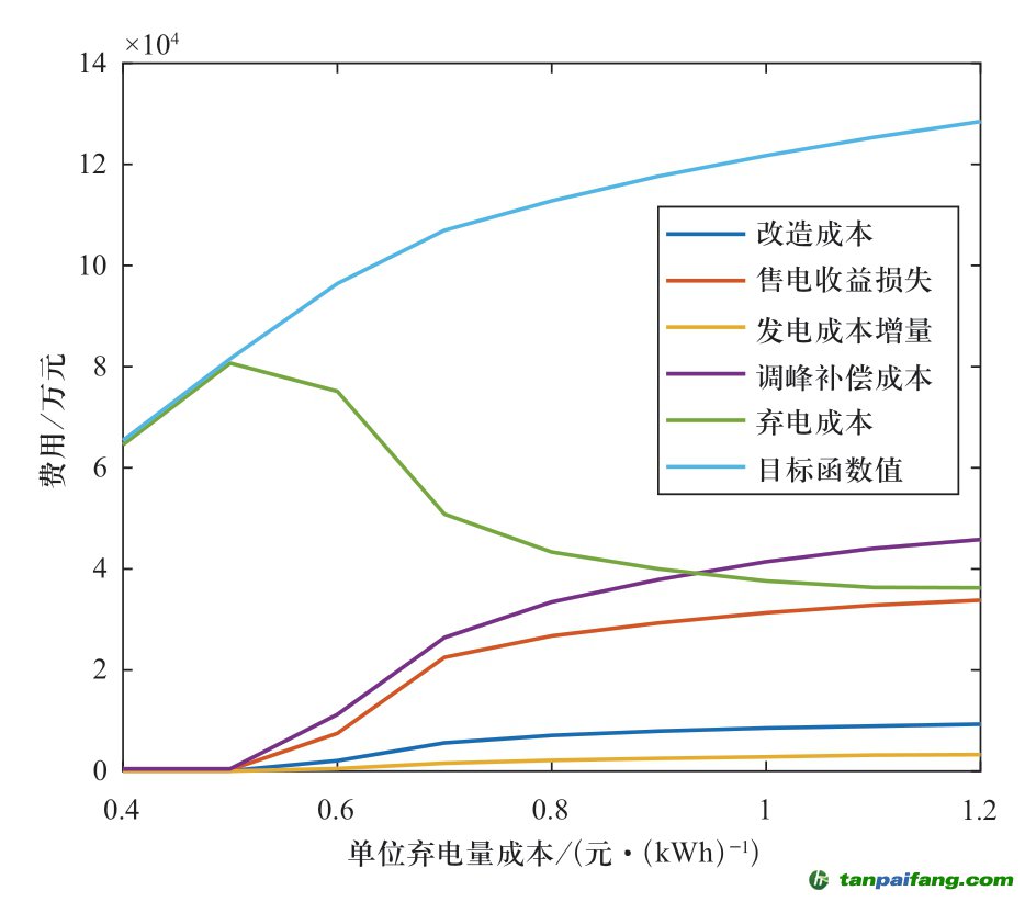 圖7展示了改造成本、調(diào)峰補(bǔ)償成本、發(fā)電成本增量、售電收益損失、總棄電成本各部分成本總和以及目標(biāo)函數(shù)值隨單位棄電量成本的變化趨勢。可以看出,隨著單位棄電成本上升,最優(yōu)結(jié)果下的目標(biāo)函數(shù)值逐漸增加,但增速逐漸放緩。棄電總成本在單位棄電成本0.5~0.8元/kWh范圍內(nèi)下降明顯,而后下降逐漸趨緩,結(jié)合圖 6,可知在較高的風(fēng)電電價水平下,繼續(xù)提高風(fēng)電電價對靈活改造吸引力減弱。另一方面,火電靈活性改造容量增加后,棄電成本降低意味著新能源電源收益上升,在新能源電價高于常規(guī)電源電價的情況下,靈活性改造導(dǎo)致系統(tǒng)整體用電成本增加。 本`文-內(nèi).容.來.自:中`國^碳`排*放*交^易^網(wǎng) ta np ai fan g.com