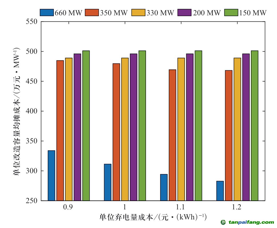 表2所示結(jié)果說明靈活改造優(yōu)先從大機(jī)組開始,下面對該結(jié)果進(jìn)行驗(yàn)證分析。在不同的單位棄電量成本下,將各機(jī)組的發(fā)電成本增量、改造成本、售電收益損失、調(diào)峰補(bǔ)償成本分別除以各自的改造容量,獲得改造容量均攤成本,如圖10所示。如前所述,各臺機(jī)組改造對系統(tǒng)棄電緩解貢獻(xiàn)程度相同,因此,機(jī)組的改造容量均攤成本決定了改造順序。圖中選取了幾個典型機(jī)組在單位棄電成本分別為0.9、1.0、1.1、1.2元/kWh時進(jìn)行計算。由圖可知,隨機(jī)組容量下降,單位改造容量的均攤成本增加,660 MW機(jī)組的均攤成本明顯低于其他機(jī)組,且隨單位棄電成本的上升而逐漸下降,其他機(jī)組則無明顯變化。 本+文`內(nèi)/容/來/自:中-國-碳-排-放-網(wǎng)-tan pai fang . com
