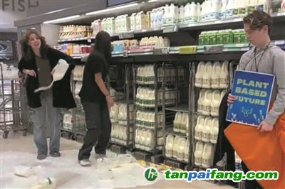 一個(gè)女子說,乳制品行業(yè)“比石油巨頭排放更多的溫室氣體”,“牛奶不適合人類食用”。