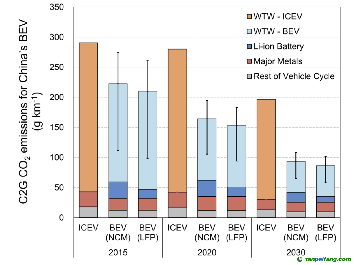 圖2.2015、2020及2030年中國(guó)純電動(dòng)汽車的全生命周期CO2排放強(qiáng)度
