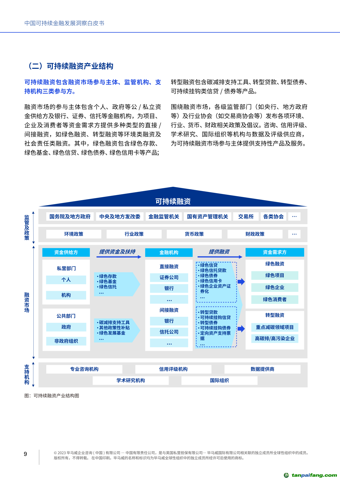 本白皮書分為三大部分,第一部分(正文第一章至第六章)從中國可持續(xù)金融全景生態(tài)入手,建立可持續(xù)金融市場分析方法論。在此基礎(chǔ)上,解讀其中各金融服務(wù)支柱、核心基礎(chǔ)設(shè)施的發(fā)展格局。分析各板塊市場現(xiàn)狀、發(fā)展瓶頸和未來方向。第二部分(正文第七章)重磅發(fā)布畢馬威2022可持續(xù)金融市場調(diào)研成果,從一線視角,分析金融從業(yè)者眼中的可持續(xù)金融市場。第三部分(正文第八章、第九章)展望中國可持續(xù)金融發(fā)展前景,總結(jié)未來五大前沿發(fā)展方向。