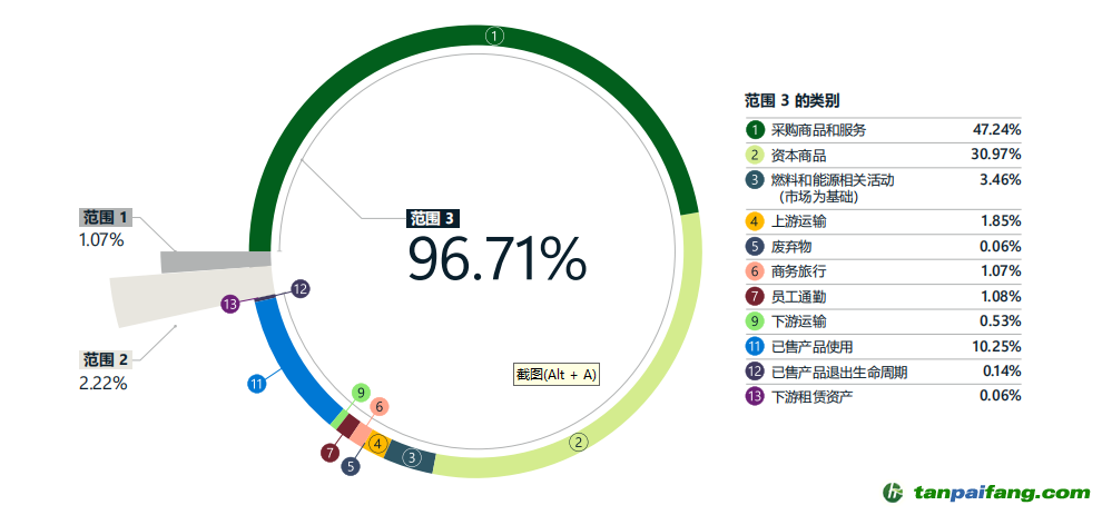 微軟在基準年份2020年的二氧化碳總排放為11444219噸,其中范圍一118100噸,范圍二456119噸,范圍三貢獻了最多的碳排放,高達10870000噸,主要來自于數(shù)以萬計的供應商(上游)以及數(shù)百萬客戶對微軟產(chǎn)品的使用(下游)。