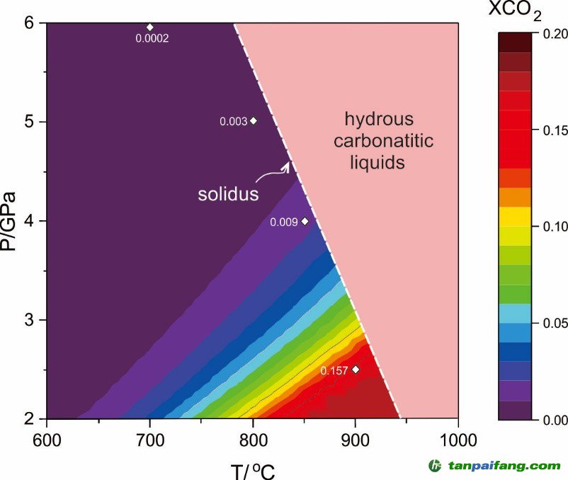 圖3. 熱力學(xué)模擬計(jì)算獲得的蛇綠碳酸巖固相線以下流體中CO2含量(摩爾比) 本+文`內(nèi).容.來.自:中`國`碳`排*放*交*易^網(wǎng) t a np ai fan g.com