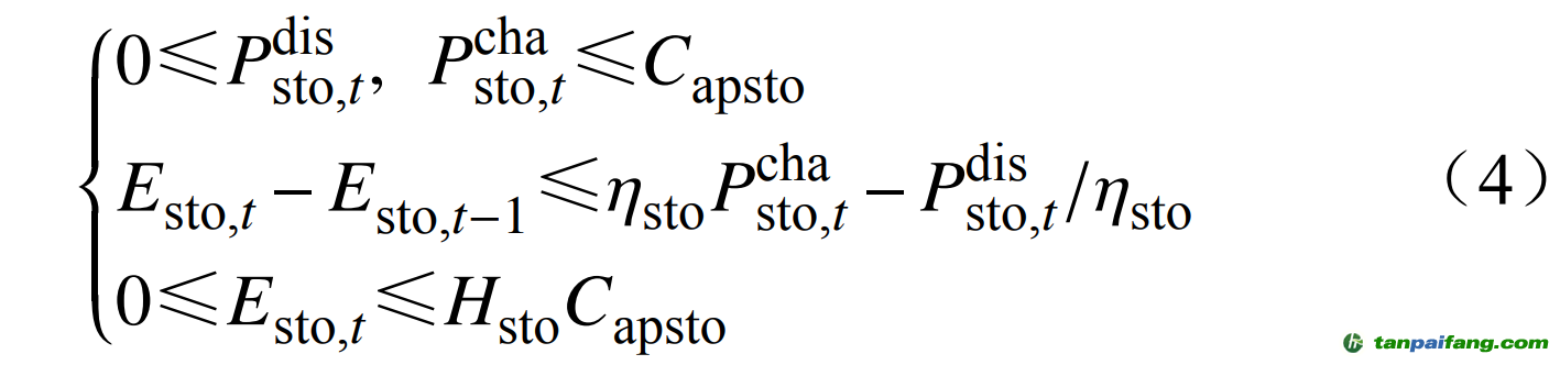 分別為時刻t儲能的放電和充電功率;Capsto 為儲能的待建功率,為優(yōu)化決策變量; Esto,t 為時刻t儲能的荷電或電量狀態(tài); ηsto 為儲能充放電效率; Hsto 為儲能持續(xù)充放電時間,一般要求儲能充放電過程滿足儲能設(shè)備的能量平衡。 本+文內(nèi).容.來.自:中`國`碳`排*放*交*易^網(wǎng) ta np ai fan g.com