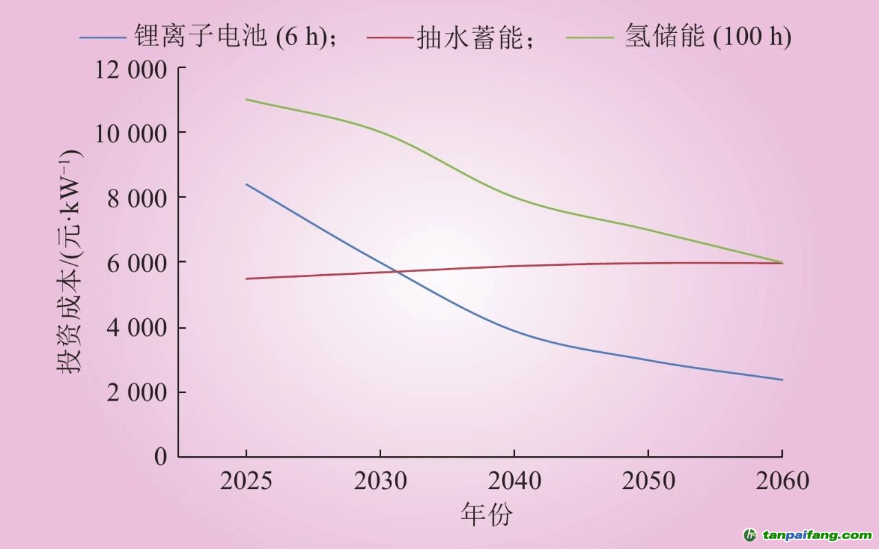 考慮短時功率型儲能和長期能量型儲能在電力系統(tǒng)中的不同作用,分別對2種儲能進行建模和優(yōu)化計算。短時儲能主要考慮抽水蓄能和鋰離子電池(新型短時儲能),兩者分開建模,抽蓄持續(xù)放電時間按照6~8 h考慮,充放電效率75%,鋰離子電池持續(xù)放電時間按照4 h考慮,充放電效率85%,結(jié)合專項規(guī)劃,分析中不再對抽蓄規(guī)模進行優(yōu)化;新型長期儲能參照包含電解槽、儲氫罐和氫發(fā)電設(shè)備的氫儲能系統(tǒng)為例,持續(xù)放電時間一般可達100 h,“電-氫-電”的充放電效率為50%。結(jié)合大規(guī)模儲能技術(shù)發(fā)展研究,以下給出不同類型儲能的投資成本變化趨勢,如圖3所示。