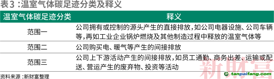 對(duì)于一家企業(yè)而言,其溫室氣體足跡來(lái)源于三大范圍:范圍一為公司擁有或控制的源頭產(chǎn)生的直接排放;范圍二為公司購(gòu)買電、暖氣等產(chǎn)生的間接排放,于普通公司而言,外購(gòu)電力是這一范圍的最大排放源;范圍三包含了公司上下游活動(dòng)產(chǎn)生的間接排放,是企業(yè)碳排放總量中占比最高,也最難識(shí)別與篩查的一部分(表3)。