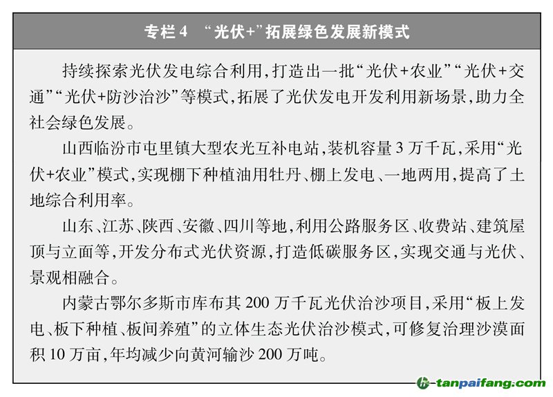 推動風(fēng)電、光伏發(fā)電躍升發(fā)展。中國風(fēng)能、太陽能資源豐富,風(fēng)電、光伏發(fā)電成為清潔能源的主力軍。有序推進(jìn)大型風(fēng)電光伏基地建設(shè),以庫布其、烏蘭布和、騰格里、巴丹吉林沙漠為重點(diǎn),規(guī)劃建設(shè)4.5億千瓦大型風(fēng)電光伏基地項目。推進(jìn)海上風(fēng)電規(guī)?;夯l(fā)展,累計裝機(jī)規(guī)模達(dá)3728萬千瓦。積極推進(jìn)分布式新能源發(fā)展,開展“千鄉(xiāng)萬村馭風(fēng)行動”“千家萬戶沐光行動”,推廣農(nóng)光互補(bǔ)、漁光互補(bǔ)、牧光互補(bǔ)等“光伏+農(nóng)業(yè)”新模式,打開了農(nóng)村新能源發(fā)展的廣闊空間。截至2023年底,中國風(fēng)電、光伏發(fā)電累計裝機(jī)容量分別達(dá)4.41億千瓦、6.09億千瓦,合計較10年前增長了10倍。其中,分布式光伏發(fā)電累計裝機(jī)容量超過2.5億千瓦,占光伏發(fā)電總裝機(jī)容量40%以上。 本+文`內(nèi)/容/來/自:中-國-碳-排-放-網(wǎng)-tan pai fang . com