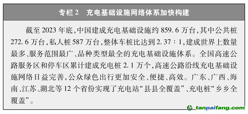 全方位構(gòu)建清潔高效的交通運(yùn)輸體系。隨著經(jīng)濟(jì)社會發(fā)展,物流、出行需求不斷增加,交通用能還將持續(xù)增長。中國加快發(fā)展多式聯(lián)運(yùn),提高鐵路、水路在綜合運(yùn)輸中的承運(yùn)比重。深入推進(jìn)城市公共交通優(yōu)先發(fā)展,構(gòu)建完善綠色出行服務(wù)體系,在城市客運(yùn)領(lǐng)域推廣應(yīng)用新能源車輛。機(jī)動車排放標(biāo)準(zhǔn)與世界先進(jìn)水平接軌,基本淘汰國三及以下排放標(biāo)準(zhǔn)汽車。運(yùn)輸能耗強(qiáng)度不斷下降,2023年鐵路單位運(yùn)輸工作量綜合能耗較2013年下降約19%。大力發(fā)展充電基礎(chǔ)設(shè)施網(wǎng)絡(luò),完善加氫、加氣站點(diǎn)布局及服務(wù)設(shè)施。截至2023年底,累計建成充電基礎(chǔ)設(shè)施近860萬臺,加氫站超過450座。