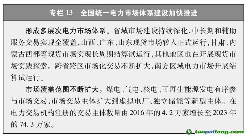 建設(shè)全國統(tǒng)一的能源市場。加快建設(shè)全國統(tǒng)一電力市場體系,省、區(qū)域、省間交易高效協(xié)同,中長期、現(xiàn)貨、輔助服務(wù)交易有機(jī)銜接。組建電力交易中心、石油天然氣交易中心和煤炭交易中心,搭建公開透明、功能完善的能源交易平臺。全國市場化交易電量占全社會用電量比重由2016年的17%提高到2023年的61.4%,2023年風(fēng)電光伏市場化交易電量占風(fēng)電光伏總發(fā)電量的47%,有力促進(jìn)了電力資源的優(yōu)化配置和可再生能源的高效利用。
