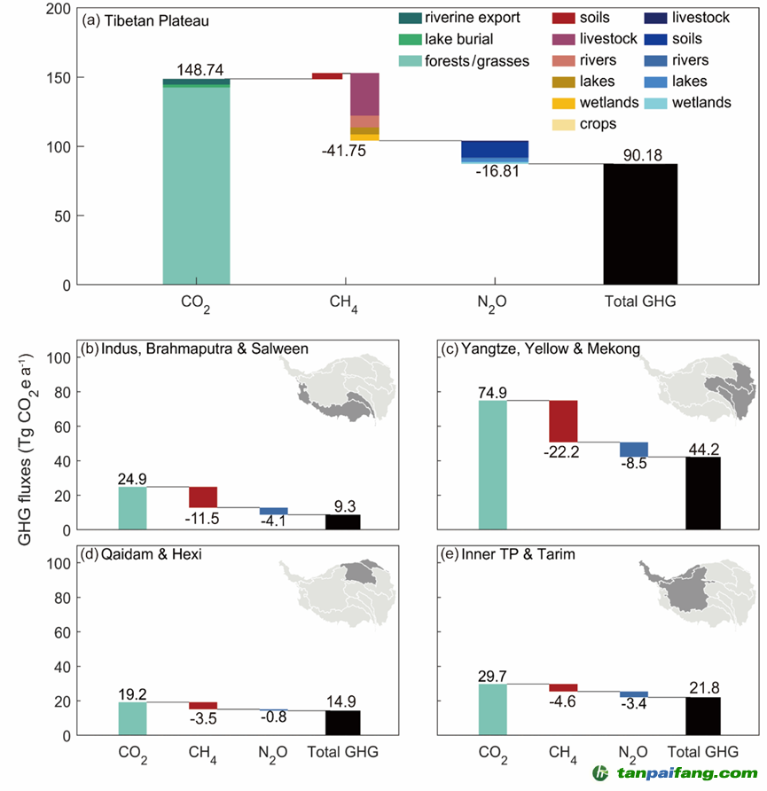 研究結(jié)果顯示,近20年來,青藏高原生態(tài)系統(tǒng)是顯著的溫室氣體匯,每年從大氣中吸收近一億噸當(dāng)量二氧化碳,近兩倍于中國(guó)陸地生態(tài)系統(tǒng)溫室氣體匯。這一顯著的溫室氣體匯主要源于二氧化碳匯。然而,超40%二氧化碳匯被非二氧化碳溫室氣體排放所抵消,其中,畜牧業(yè)和內(nèi)陸水體(包括熱融喀斯特湖)的年排放量分別占二氧化碳匯的21%和13%(圖1)。值得注意的是,高原生態(tài)系統(tǒng)溫室氣體匯幾乎中和了高原能源與工業(yè)產(chǎn)生的溫室氣體排放。 本`文@內(nèi)-容-來-自;中^國(guó)_碳0排0放^交-易=網(wǎng) ta n pa i fa ng . co m