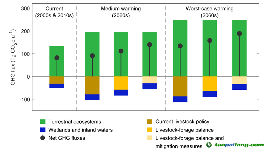 研究進(jìn)一步發(fā)現(xiàn),在中等排放情景下,未來生態(tài)系統(tǒng)二氧化碳匯持續(xù)增強(qiáng),水體擴(kuò)張和多年凍土持續(xù)退化等導(dǎo)致的非二氧化碳溫室氣體排放仍將不及二氧化碳匯,因此,到2060年高原仍是顯著的溫室氣體匯。然而,溫室氣體匯大小依賴于高原畜牧業(yè)未來發(fā)展路徑的選擇:如果仍維持當(dāng)前不可持續(xù)的放牧狀態(tài),畜牧業(yè)的非二氧化碳溫室氣體排放的增加將完全抵消生態(tài)系統(tǒng)二氧化碳匯增量;有效實(shí)施草畜平衡管理并開展減排措施以降低牲畜非二氧化碳溫室氣體排放強(qiáng)度,高原溫室氣體匯大小預(yù)計(jì)將比當(dāng)前增加1.5倍(圖2),因此,推進(jìn)可持續(xù)且高效的畜牧業(yè)發(fā)展路徑將大幅減少高原畜牧業(yè)溫室氣體排放,增強(qiáng)青藏高原對(duì)我國(guó)碳中和戰(zhàn)略的貢獻(xiàn)。