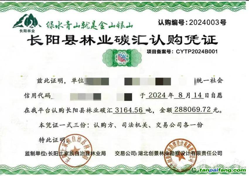 經(jīng)宜昌中院組織調(diào)解,雙方當(dāng)事人就認(rèn)購(gòu)碳匯達(dá)成一致意見,簽訂調(diào)解協(xié)議,被告某公司自愿購(gòu)買長(zhǎng)陽林業(yè)碳票履行生態(tài)損害賠償責(zé)任,認(rèn)購(gòu)金額288069.72元,認(rèn)購(gòu)碳匯量3164.56噸。