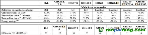 歐盟在出臺(tái)2020至2030年能源與氣候政策前,曾經(jīng)對(duì)不同政策組合的情景進(jìn)行了詳細(xì)評(píng)估,評(píng)估結(jié)果顯示并行機(jī)制(如節(jié)能政策、可再生能源政策)對(duì)碳市場(chǎng)配額價(jià)格將產(chǎn)生劇烈的影響。歐盟認(rèn)為保障碳市場(chǎng)價(jià)格有穩(wěn)定和清晰的信號(hào)是歐盟能源與氣候政策的首要目標(biāo)。歐盟委托的團(tuán)隊(duì)曾經(jīng)開展政策影響分析(Impact Assessment),分析了成員國實(shí)施約束性的節(jié)能目標(biāo)、約束性的可再生能源目標(biāo)等與碳市場(chǎng)形成合力的政策組合,來實(shí)現(xiàn)到2030年相比1990年40%的絕對(duì)量減排目標(biāo)。