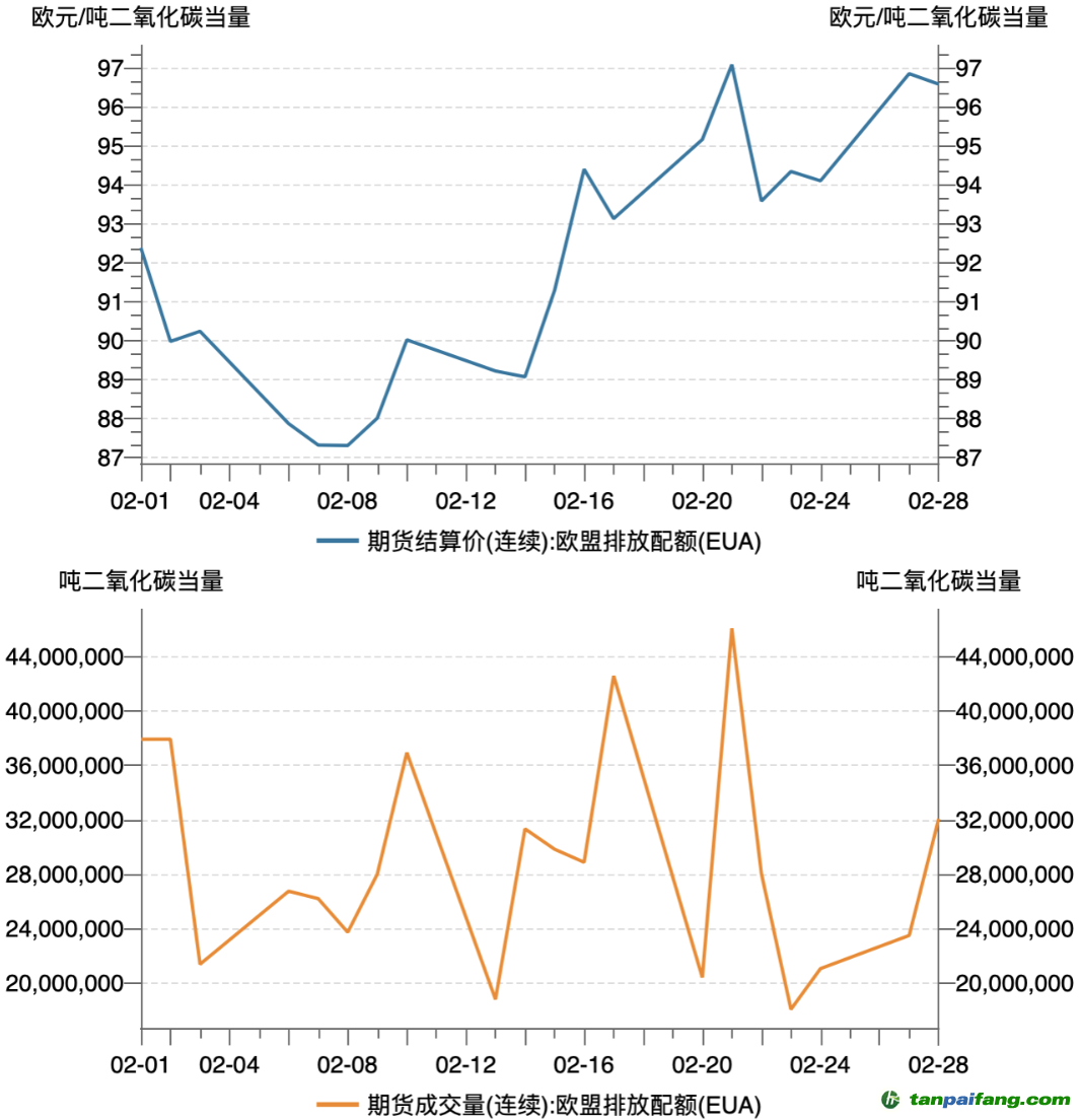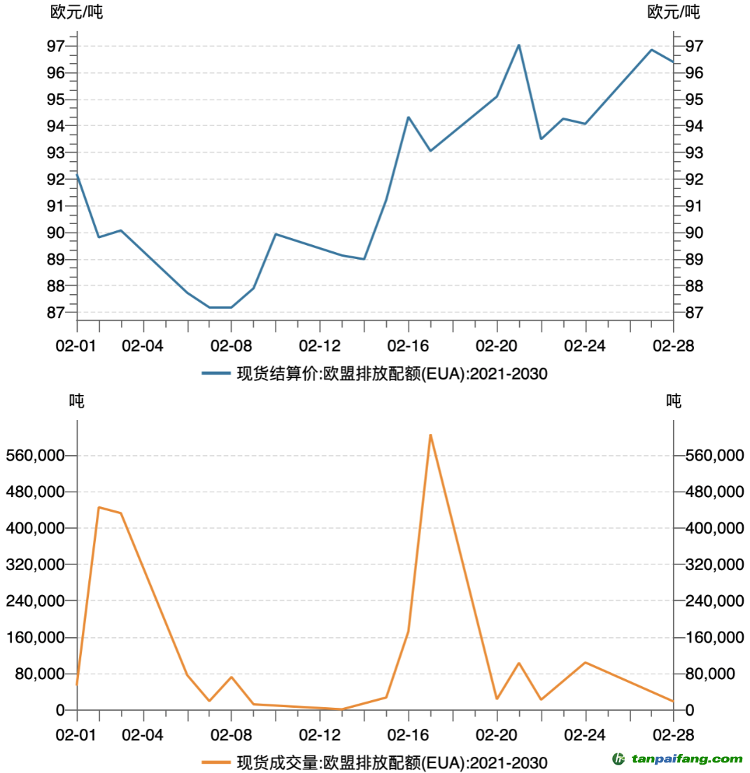 2月歐盟碳排放配額(EUA)現(xiàn)貨總成交量219.80萬噸,總成交金額2.01億歐元,現(xiàn)貨成交均價(jià)91.67歐元/噸;期貨總成交量5.79億噸,總成交金額533.05億歐元,期貨成交均價(jià)92.02歐元/噸。2月EUA現(xiàn)貨結(jié)算價(jià)最低87.18歐元/噸,最高97.04歐元/噸;期貨結(jié)算價(jià)最低87.31歐元/噸,最高97.08歐元/噸。