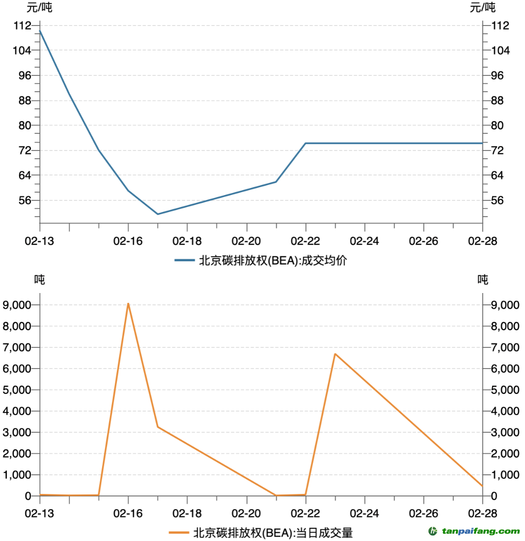 2月北京碳市場(chǎng)碳排放配額(BEA)總成交量1.96萬噸,總成交額124.57萬元,成交均價(jià)63.50元/噸。2月最后一個(gè)交易日成交均價(jià)74.20元/噸,較1月最后一個(gè)交易日成交均價(jià)138.00元/噸下降了46.23%。截至2月28日,BEA累計(jì)成交量1819.09萬噸,累計(jì)成交額12.29億元。