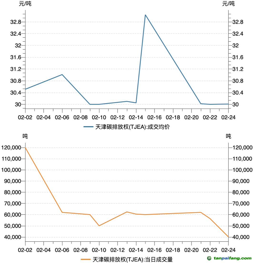 2月天津碳市場(chǎng)碳排放配額(TJEA)總成交量63.33萬噸,總成交額1931.37萬元,月成交均價(jià)30.50元/噸。2月最后一個(gè)交易日成交均價(jià)30.01元/噸,較1月最后一個(gè)交易日成交均價(jià)30.03元/噸下跌0.07%。截至2月28日,TJEA累計(jì)成交量2518.05萬噸,累計(jì)成交額6.30億元。