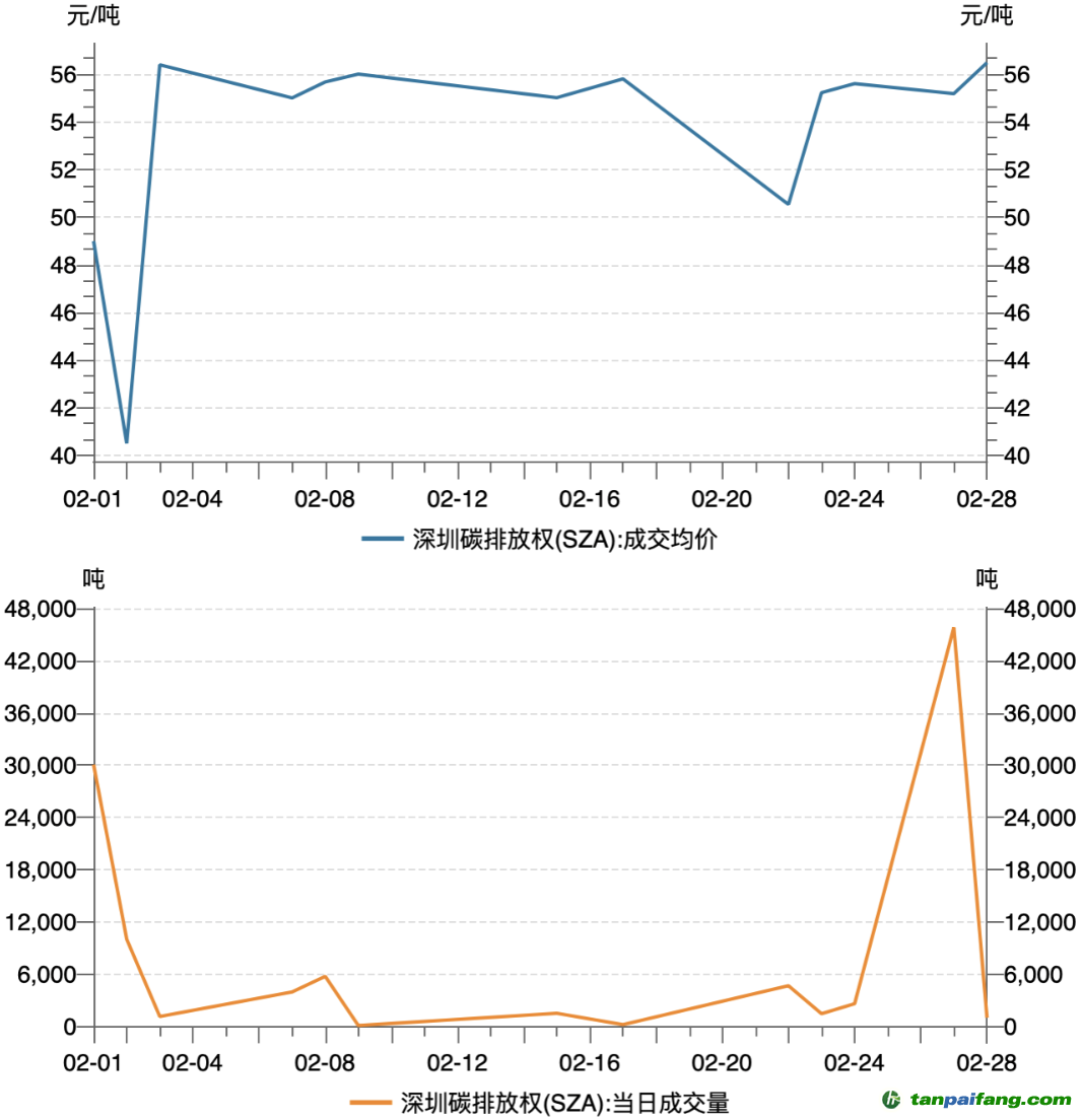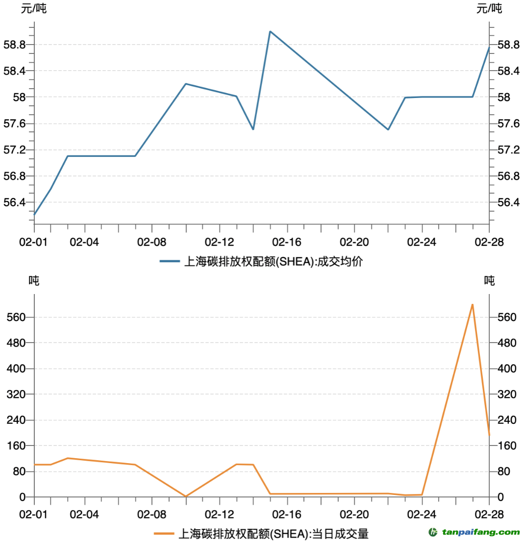 2月上海碳市場(chǎng)碳排放配額(SHEA)總成交量1442噸,總成交額8.32萬元,成交均價(jià)57.71元/噸。2月最后一個(gè)交易日收盤價(jià)58.76元/噸,較1月最后一個(gè)交易日收盤價(jià)56.66元/噸上漲3.71%。截至2月28日,SHEA累計(jì)成交量1945.09萬噸,累計(jì)成交額6.38億元。