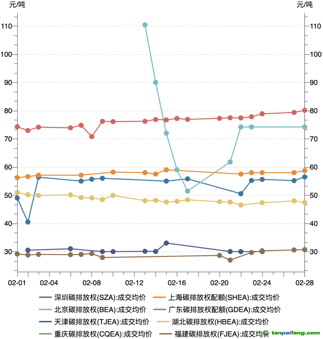 地方碳市場(chǎng)方面,除北京碳市場(chǎng)外,其余地方試點(diǎn)碳價(jià)相對(duì)平穩(wěn)。北京碳市場(chǎng)2月中旬起出現(xiàn)交易,碳價(jià)呈斷崖式下跌,成交均價(jià)由110.40元/噸降至51.47元/噸,最大跌幅達(dá)到53.38%,后有所回升,月末維持在74.20元/噸。在北京碳價(jià)下跌的同時(shí),廣東碳價(jià)穩(wěn)中有升,2月下半月超越北京碳價(jià),月末成交均價(jià)達(dá)到80.12元/噸,成為八個(gè)地方碳市場(chǎng)中碳價(jià)最高的市場(chǎng)。2月2日,廣州市生態(tài)環(huán)境局印發(fā)《廣州市碳普惠自愿減排實(shí)施辦法》。上海和湖北碳市場(chǎng)運(yùn)行平穩(wěn),成交均價(jià)分別位于56.20-59.00元/噸和46.51-50.99元/噸之間。深圳碳價(jià)出現(xiàn)一定程度的上漲,月末成交均價(jià)為56.48元/噸,較月初上漲15.29%。重慶碳市場(chǎng)2月未出現(xiàn)交易。天津和福建碳價(jià)相差較小,天津碳價(jià)在30.00-33.04元/噸之間,福建碳價(jià)在27.00-30.70元/噸之間。 本`文-內(nèi).容.來.自:中`國^碳`排*放*交^易^網(wǎng) ta np ai fan g.com