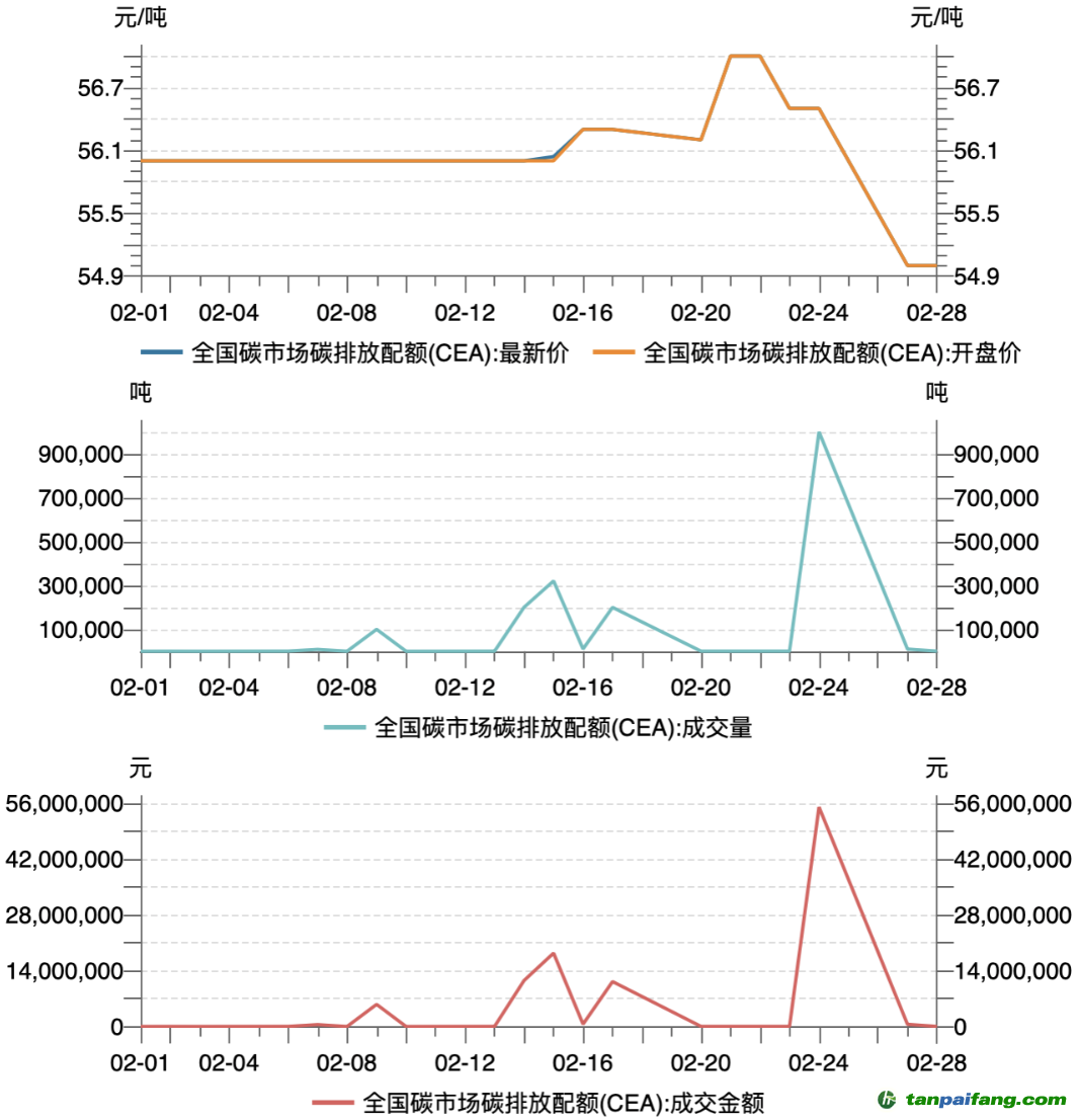 2月全國碳市場(chǎng)碳排放配額(CEA)總成交量185.43萬噸,總成交額1.04億元。掛牌協(xié)議交易月成交量25.43萬噸,月成交額1429.58萬元,最高成交價(jià)57.50元/噸,最低成交價(jià)55.00元/噸。2月最后一個(gè)交易日收盤價(jià)為55.00元/噸,較1月最后一個(gè)交易日下跌1.79%。大宗協(xié)議交易月成交量160萬噸,月成交額8930萬元。截至2月28日,CEA累計(jì)成交量2.32億噸,累計(jì)成交額105.93億元。 本+文`內(nèi)/容/來/自:中-國-碳-排-放-網(wǎng)-tan pai fang . com