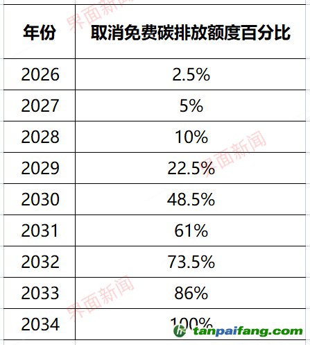 CBAM將從2026-2034年逐步實施,其速度與歐盟排放交易體系中的免費配額逐步取消的速度相同。這一開始時間較去年6月所公布的時間提早了一年。