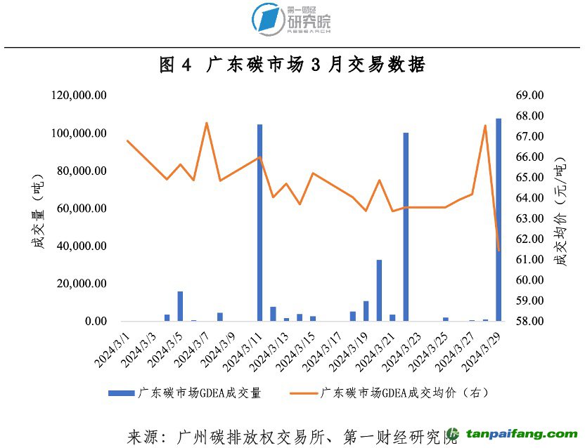 3月廣東碳市場碳排放配額(GDEA)成交量40.93萬噸,成交額2614.89萬元期間,最高價(jià)74.28元/噸,最低價(jià)62.51元/噸,成交均價(jià)63.88元/噸。3月最后一個(gè)交易日收盤價(jià)66.61元/噸,較2月最后一個(gè)交易日收盤價(jià)66.39元/噸上漲0.33%。截至331日,GDEA累計(jì)成交量2.25億噸,累計(jì)成交額64.27億元