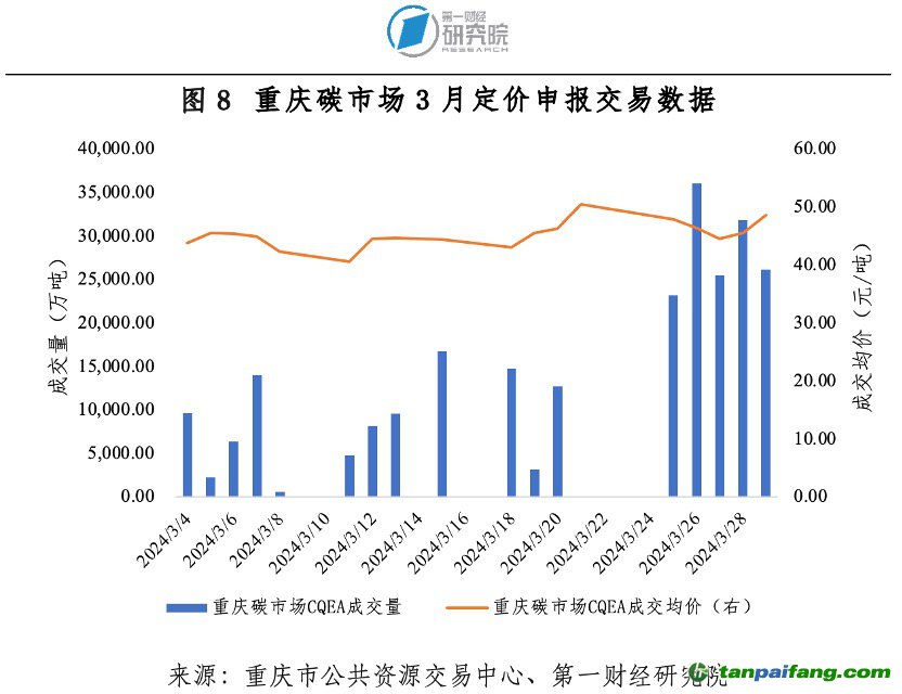 3月重慶碳市場碳排放配額(CQEA)定價(jià)申報(bào)交易成交量24.50萬噸,成交金額1117.05萬元;成交申報(bào)交易成交量139.27萬噸,成交金額5673.84萬元。