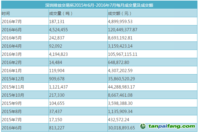 截止2016年9月12日,深圳排放交易所累計成交量近1576萬噸,累計成交額5.4億元。2015年-2016年,隨著深圳排放交易試點的不斷發(fā)展,成交量和成交額相對往年都有大幅增加。2015年6月-2016年7月,交易所成交量累計達1260萬噸,累計成交額達3.7億噸。