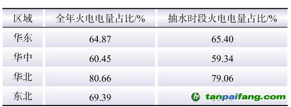 根據(jù)計算結(jié)果,華東、華中和東北區(qū)域的火電電量占比較低,在60%~69%之間,華北區(qū)域的火電電量占比最高,達到80%。同時,電站抽水時段火電占比相對全年平均值略低,只有華東區(qū)域的抽水時段火電占比更高。