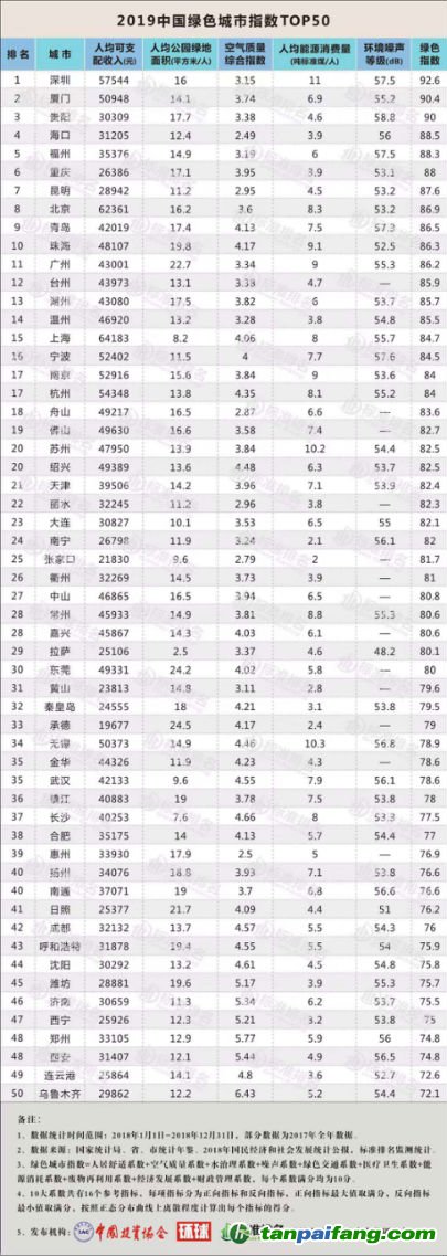 在《2019中國綠色城市指數(shù)TOP50》中,南方城市領(lǐng)跑綠色指數(shù),北方城市整體排名較為靠后,僅有北京、青島進(jìn)入前十。此外,城市的人均可支配收入差距較大,能源消耗也較大,空氣質(zhì)量得到了顯著提升,城市綠地面積仍需增加,有九成城市的環(huán)境噪聲等級(jí)超過50。 本`文-內(nèi).容.來.自:中`國^碳`排*放*交^易^網(wǎng) ta np ai fan g.com
