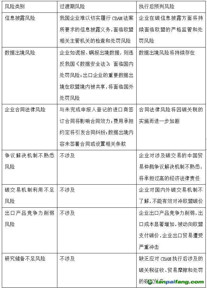 天達(dá)共和碳合規(guī)法律服務(wù)律師結(jié)合相關(guān)研究與實(shí)際案件將中國(guó)企業(yè)在歐盟CBAM中面臨的現(xiàn)實(shí)困境按照影響方面、風(fēng)險(xiǎn)類別及潛在后果進(jìn)行匯總,供大家參閱。 本@文$內(nèi).容.來(lái).自:中`國(guó)`碳`排*放^交*易^網(wǎng) t a np ai fan g.c om