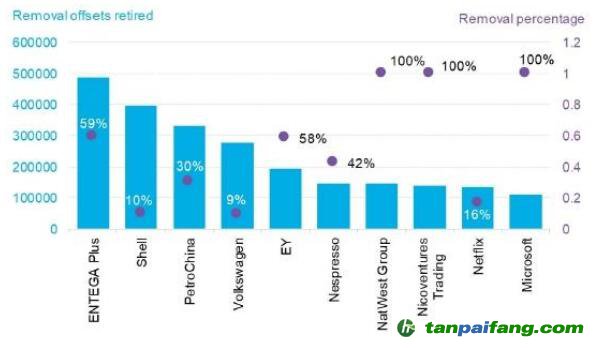 即使對(duì)于清除性碳抵消的最大買家來說,這些也僅僅是他們碳抵消總資產(chǎn)的一部分。德國(guó)電力供應(yīng)商Entega Plus GmbH注銷的來自烏拉圭復(fù)植補(bǔ)種項(xiàng)目的碳抵消量為48.8萬,而這一數(shù)字在其2021年Verra資產(chǎn)中的比例僅為59%。NatWest Group PLC(14萬)和微軟(10.9萬)幾乎全部依賴于清除性碳抵消,但他們的絕對(duì)購買量較小。