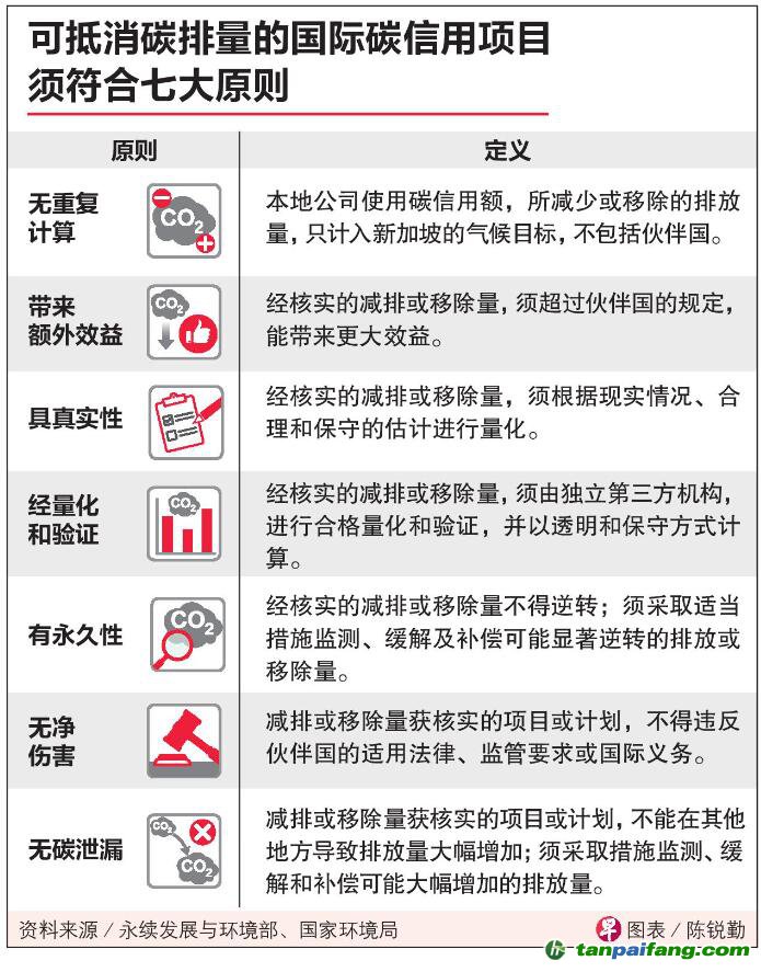 永續(xù)部和環(huán)境局說,新加坡核準(zhǔn)的碳信用項(xiàng)目須符合政府設(shè)定的七大原則,即避免重復(fù)計算、能帶來額外效益、真實(shí)性、經(jīng)量化和驗(yàn)證、永久性、無凈傷害,以及無碳泄漏。