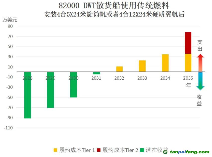 如8.2萬DWT散貨船的貨艙區(qū)安裝4臺(tái)5米X24米旋筒帆或4臺(tái)12米X24米硬質(zhì)翼帆,預(yù)計(jì)為船舶提供的輔助推進(jìn)有效功率約為1860kW,為船舶帶來的節(jié)油效果約為27%。安裝風(fēng)力輔助推進(jìn)系統(tǒng)后的船舶在滿足新規(guī)下為船舶帶來的收益如下圖所示: 禸嫆@唻洎:狆國(guó)湠棑倣茭昜蛧 τāńpāīfāńɡ.cōm