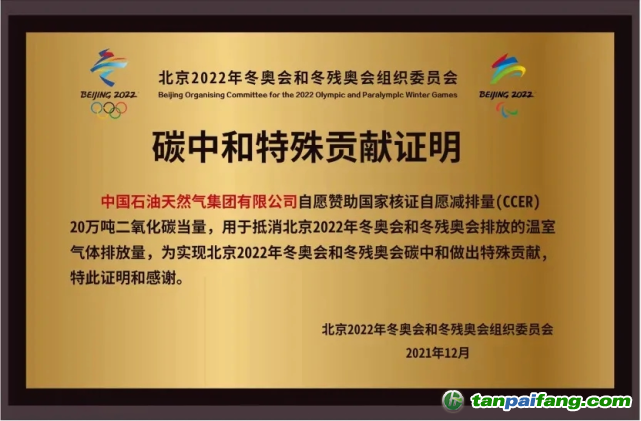 1月4日,中國(guó)石油收到了一份特殊“榮譽(yù)”——由北京冬奧組委頒發(fā)的“碳中和特殊貢獻(xiàn)證明”牌匾,因其自愿贊助20萬(wàn)噸國(guó)家核證自愿減排量(CCER),用于碳抵消。