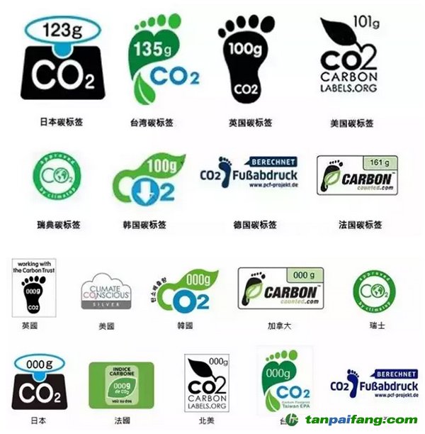 各國/地區(qū)產(chǎn)品碳標識圖案 本*文@內(nèi)-容-來-自;中_國_碳^排-放*交-易^網(wǎng) t an pa i fa ng . c om