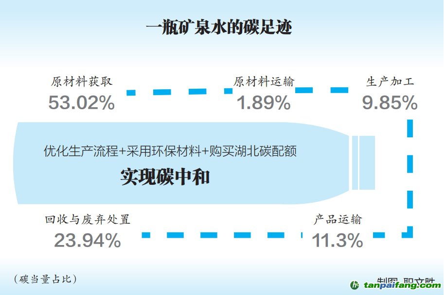 報告顯示:每生產(chǎn)一瓶550毫升的礦泉水,需要經(jīng)過原材料獲取、原材料運輸、生產(chǎn)加工、產(chǎn)品運輸以及回收與廢棄處置五個關(guān)鍵環(huán)節(jié),共產(chǎn)生碳足跡總值為232.4克二氧化碳當(dāng)量。其中,原材料獲取階段的碳排放量,約占碳足跡總值的一半;回收與廢棄處置階段,約占碳足跡總值的1/4,這進(jìn)一步說明礦泉水瓶的回收利用及廢棄物處理面臨很大的環(huán)保壓力。 夲呅內(nèi)傛萊源?。骇鎲┨?排*放^鮫*易-網(wǎng) τā ńpāīfāńɡ.cōm