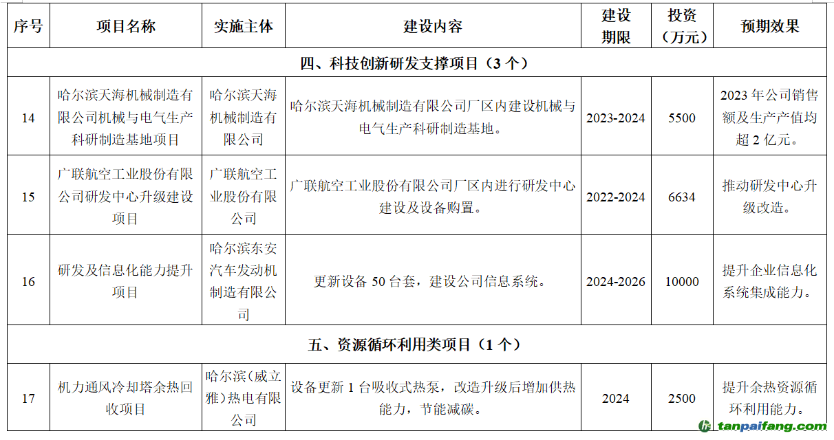 資源循環(huán)利用項目1項,投資0.25億元,為哈爾濱(威立雅)熱電有限公司機力通風(fēng)冷卻塔余熱回收項目,提升余熱資源循環(huán)利用能力。 本`文@內(nèi)-容-來-自;中_國_碳排0放_交-易=網(wǎng) t an pa ifa ng . c om
