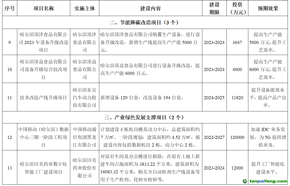節(jié)能降碳改造項目3項,總投資1.95億元,包括哈爾濱頂津食品有限公司2023年設(shè)備升級改造項目、哈爾濱頂益食品有限公司設(shè)備升級綜合技改項目、哈爾濱東安汽車動力股份有限公司技術(shù)改造產(chǎn)線升級項目。