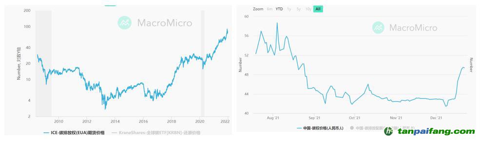 圖表 2 歐洲和中國(guó)碳交易市場(chǎng)行情 內(nèi).容.來(lái).自:中`國(guó)*碳-排*放*交*易^網(wǎng) t a npai fa ng.com