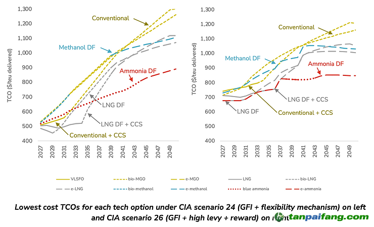 該研究報告稱,目標(biāo)型船用燃料標(biāo)準(zhǔn)(GFS)與靈活履約機(jī)制相結(jié)合不太可能在 2044年之前產(chǎn)生具有競爭力的電制燃料?;剂希ò?LNG)、生物燃料和 CCS 的組合將在2036年之前最具競爭力,此后氨雙燃料船將成為成本最低的解決方案,使用藍(lán)氨的經(jīng)濟(jì)性可至2044年。 本`文@內(nèi)-容-來-自;中_國_碳排0放_交-易=網(wǎng) t an pa ifa ng . c om