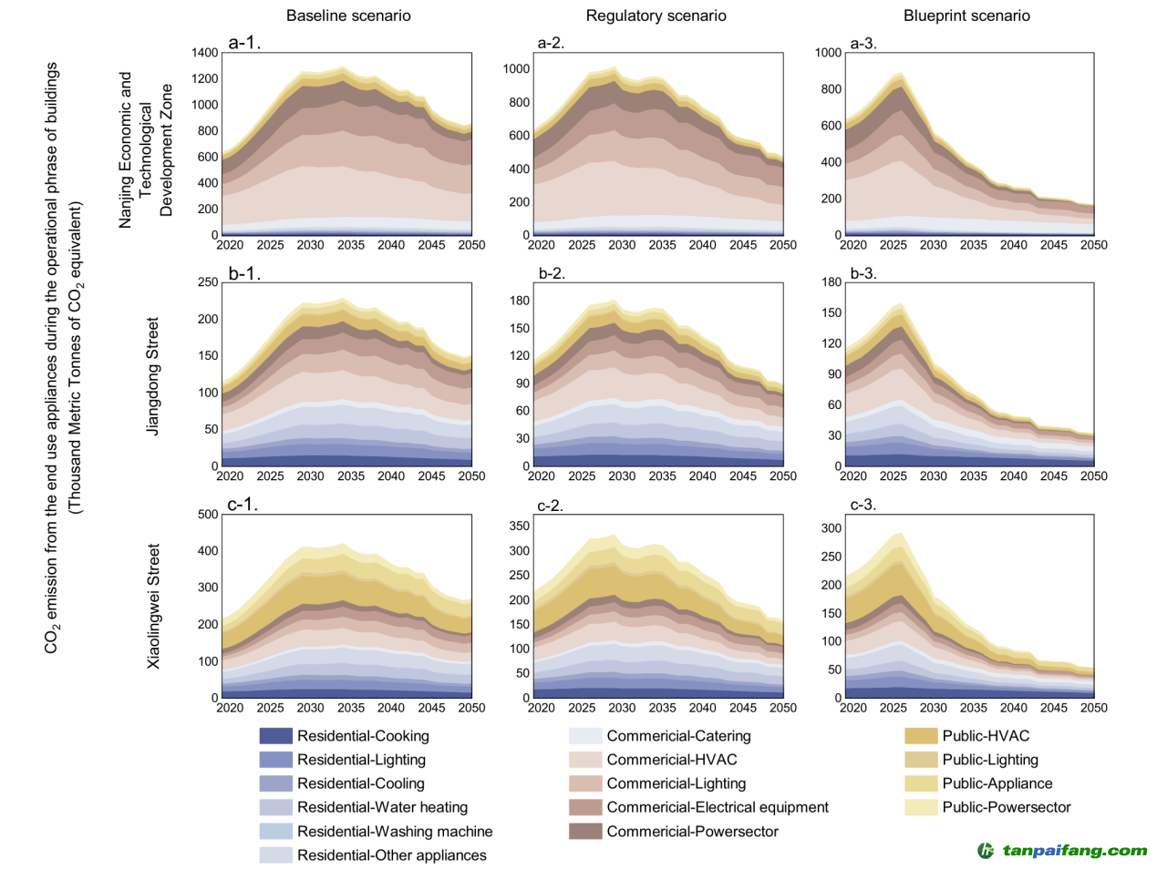 圖2.不同減排情景下典型街道的碳排放路徑(2020-2050) 本文`內(nèi)-容-來-自;中_國_碳_交^易=網(wǎng) tan pa i fa ng . c om